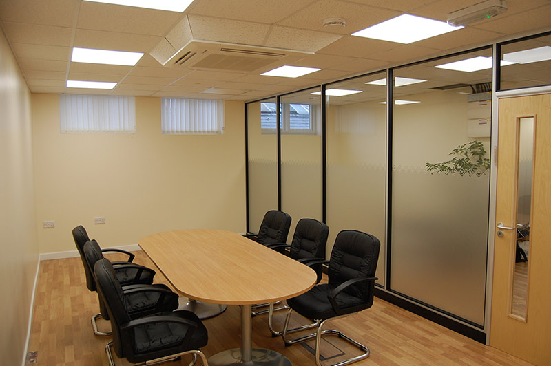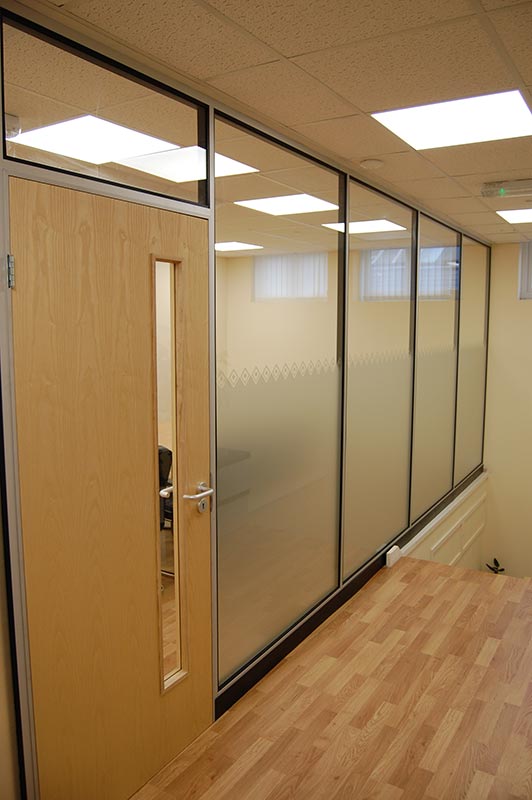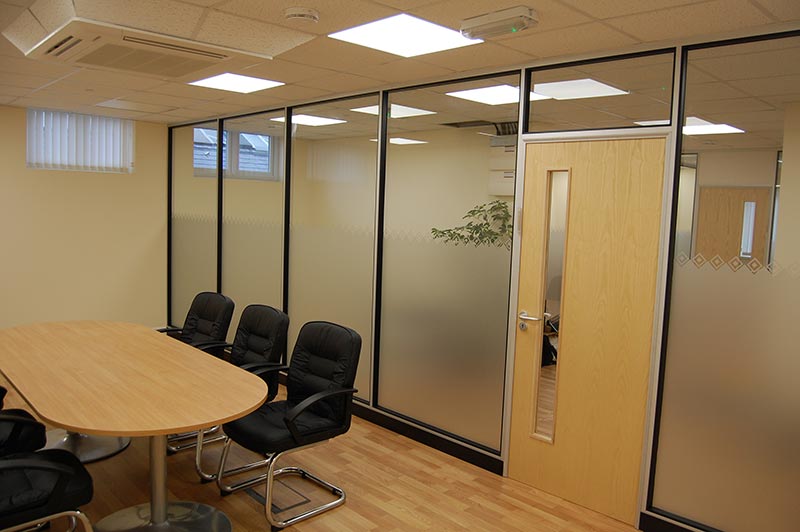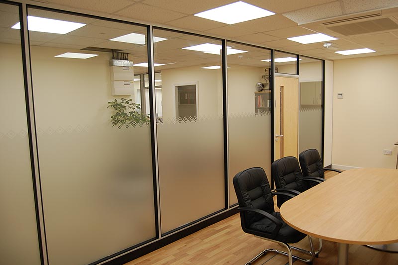 The meeting and boardroom front wall was to have full height single glazed windows installed into the system at dado levels of 100mm from the floor to a full height of 2.45m.