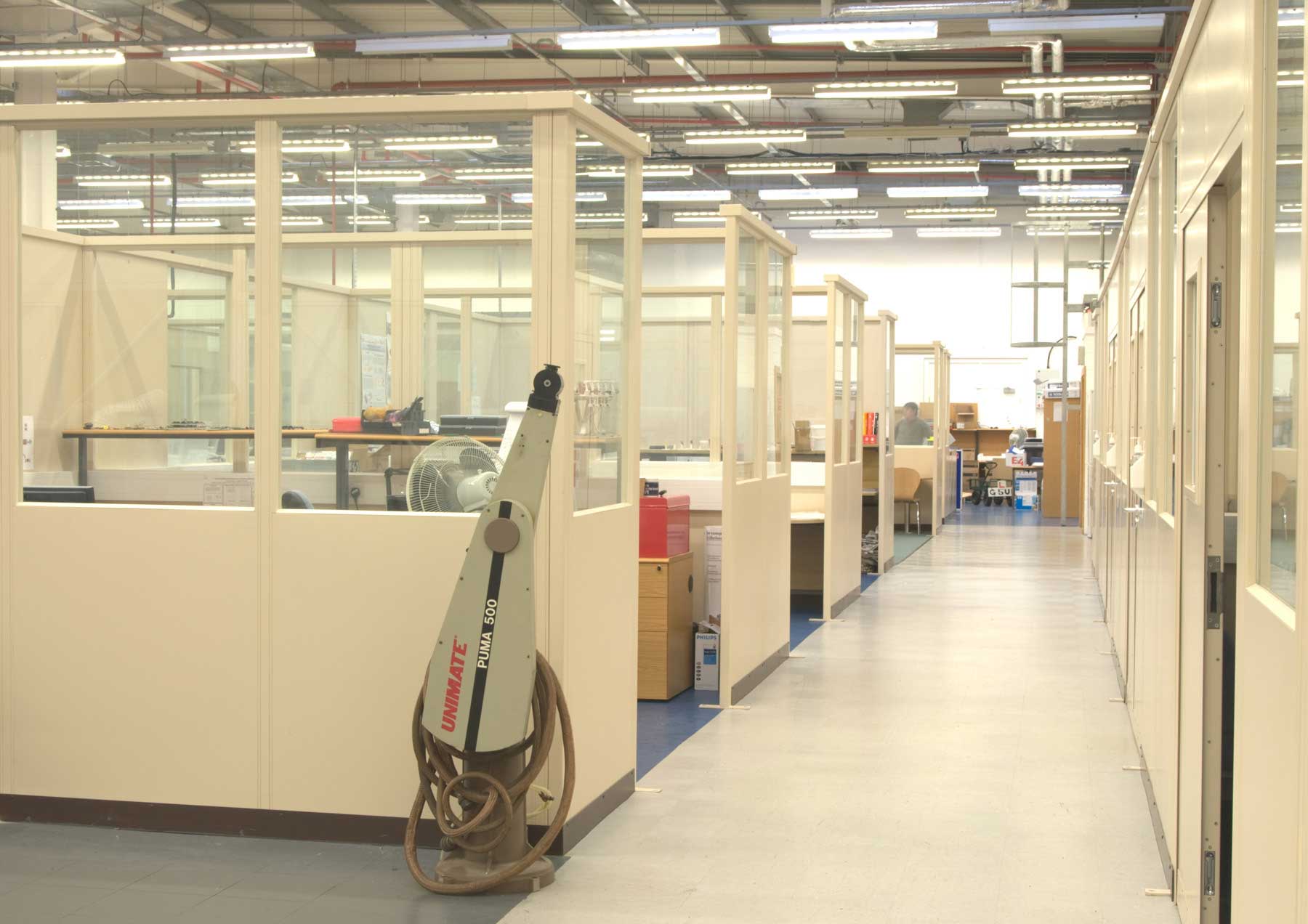 Or you can have the panels at standard heights (usually between 2.4m and 3m high depending on manufacturer) and we could install suspended ceilings within the partition perimeter to form small rooms that can also retain heat and have closer task lighting or ventilation / extraction etc built into the ceiling.