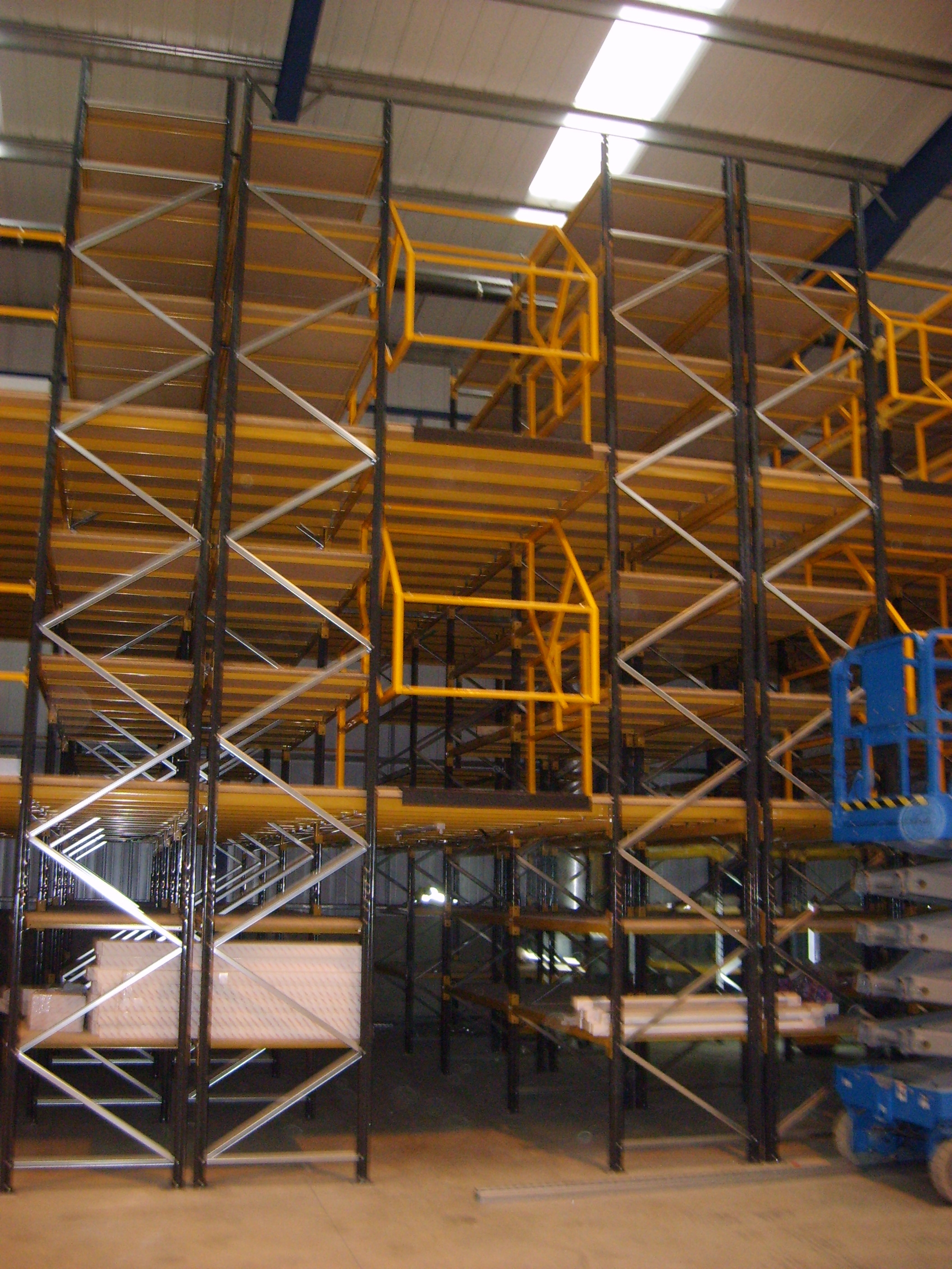 The ground floor racking frames protrude through the decking level to form the racking on the first and or second floors and shelf beams / panels are added as and where needed.