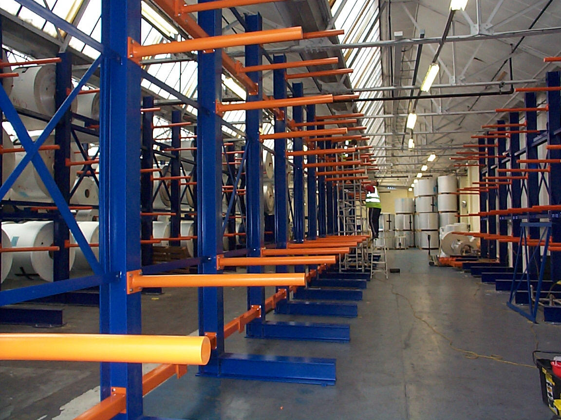 Cantilever Bar racks can can be small lightweight racking to store long items weighing very little, such as conduit, trunking, cable trays, guttering, or they can be heavy duty and designed to suit bespoke purposes. For example we have supplied and installed racks designed to hold very large reels of paper without damaging them, prior to use by the factory, and we have also fitted purpose built bar racks to store printing plates, steel and aluminium sheets and even fitted some with timber decks to accommodate loads that would normally fall between the upright arms.
